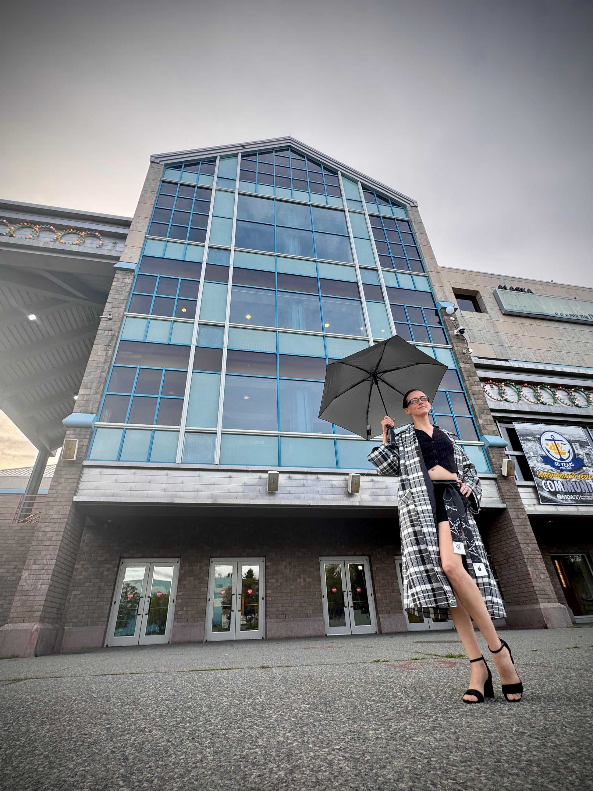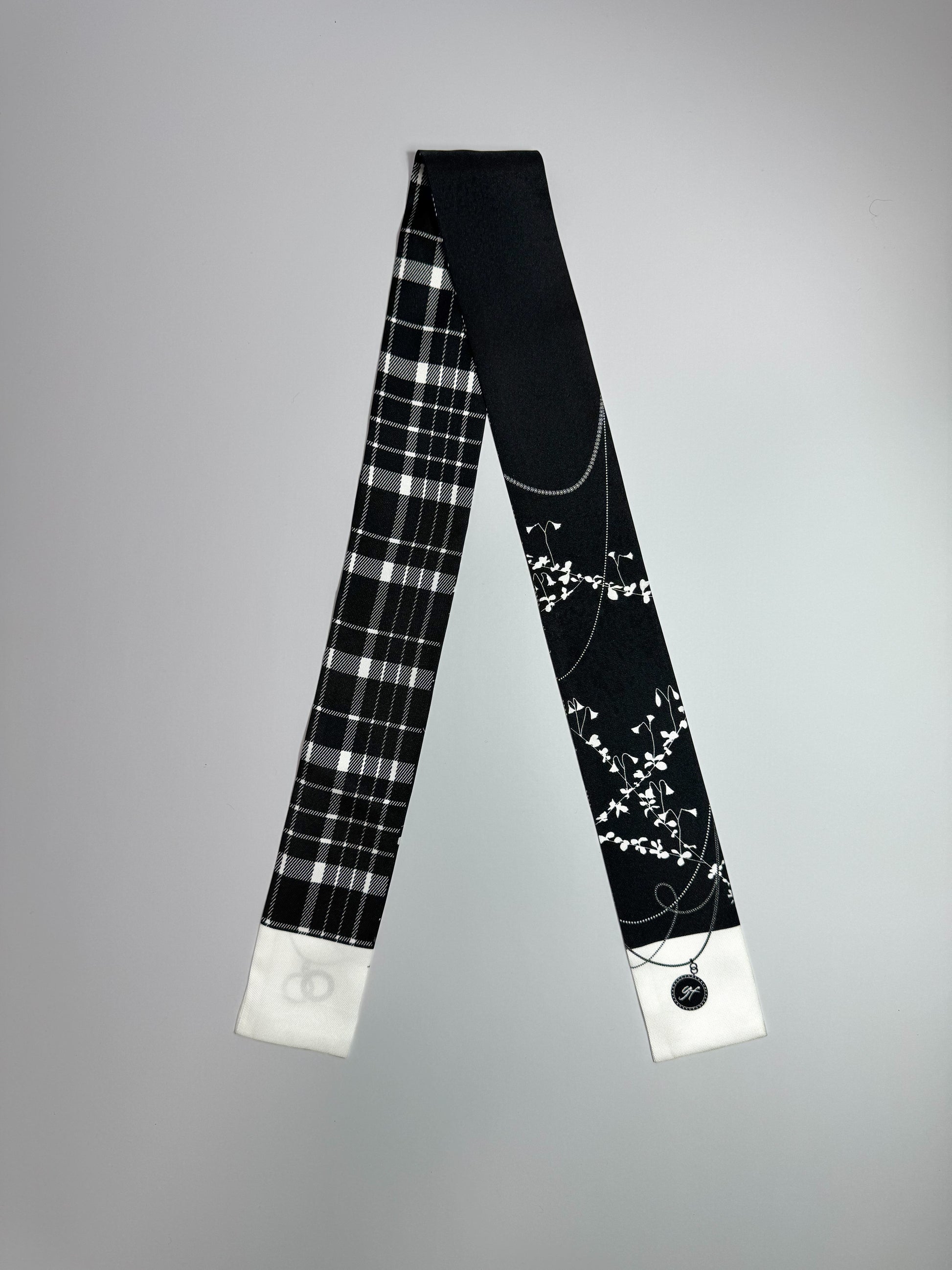 Inspired by the 1% for arts elements of the second-floor bathroom of The Alaska Center for Performing Arts (PAC), this double-sided silk scarf features signature gutterflowers charms, pearls, twinflowers, and a bespoke plaid reminiscent of the iconic window wall seen from Time-Square.
